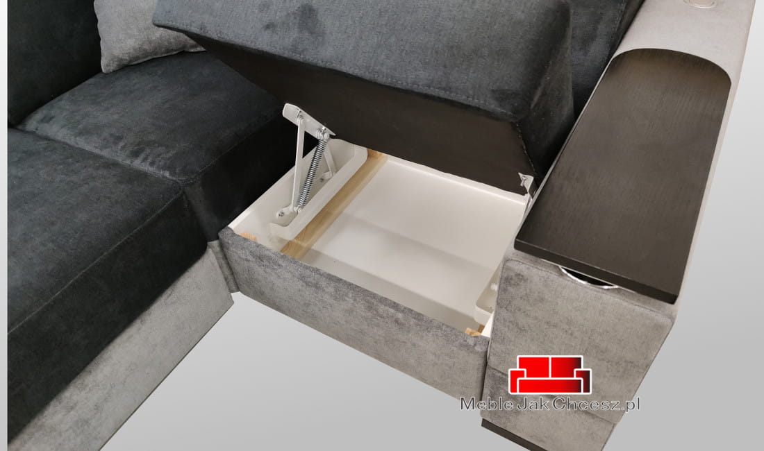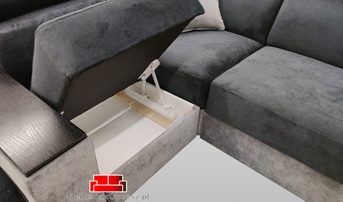 Funkcja spania typu „delfin” umożliwia szybkie rozłożenie narożnika do roli pełnowymiarowego łóżka. Pojemnik na pościel to wygodne rozwiązanie ułatwiające codzienne przechowywanie.