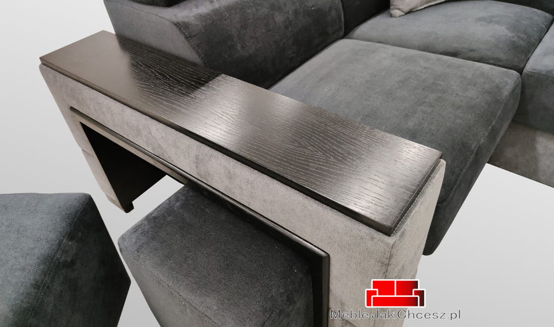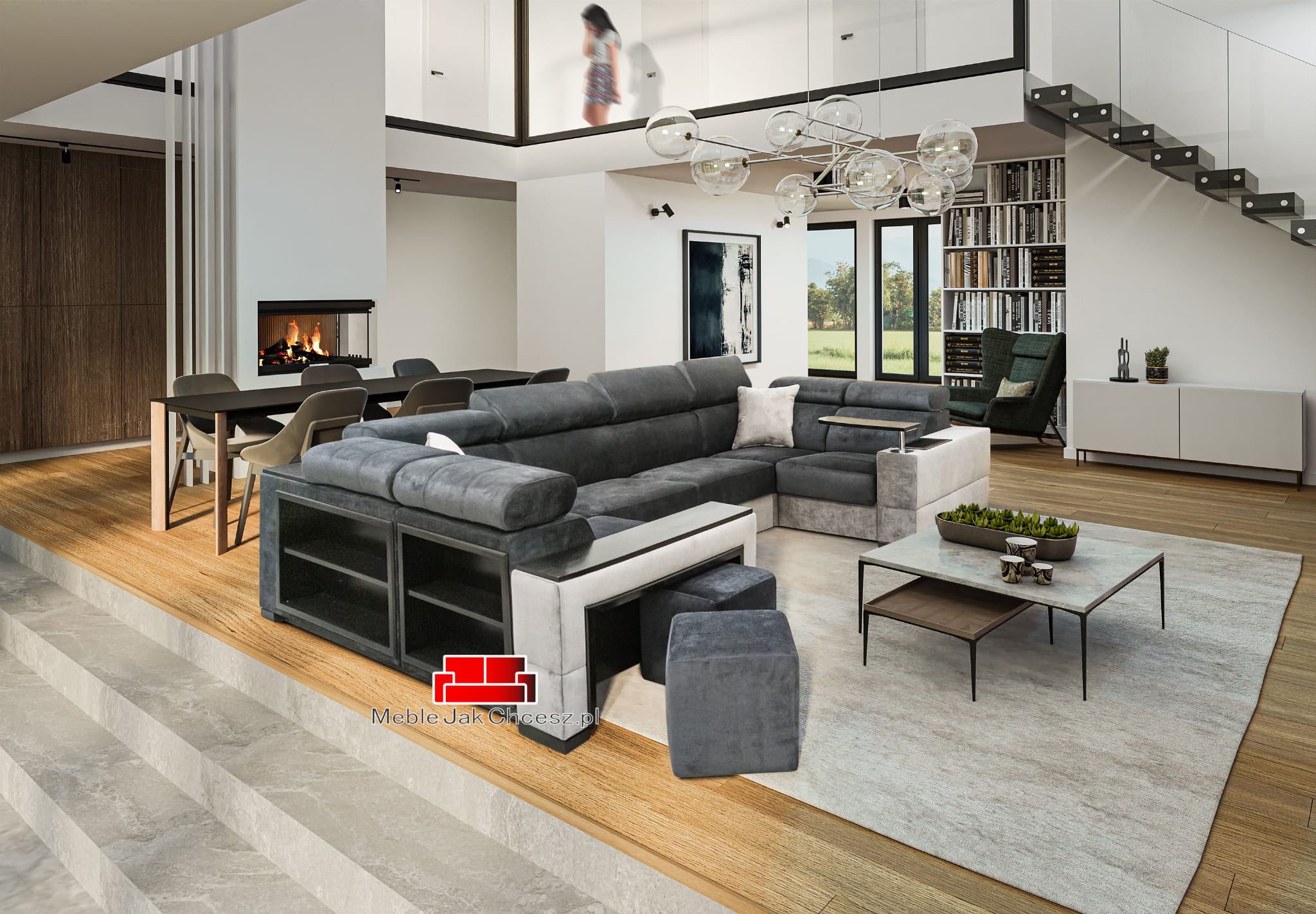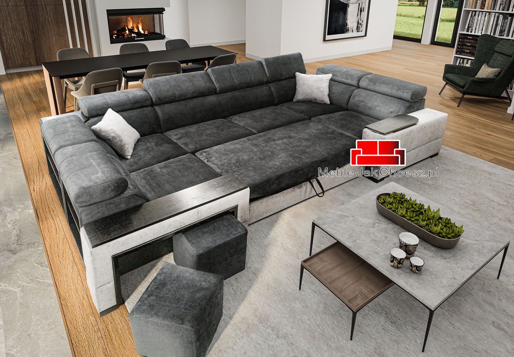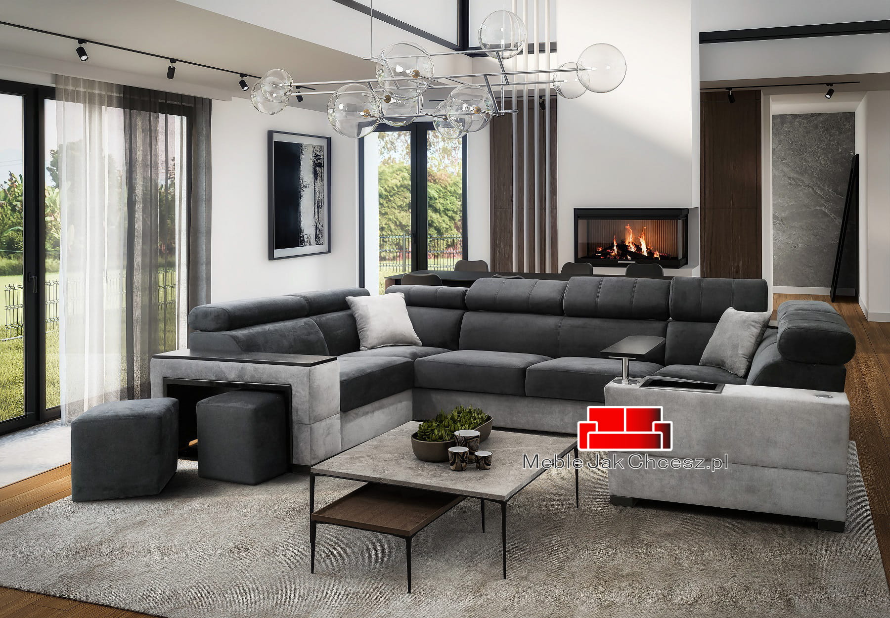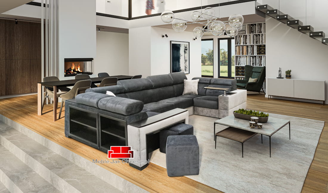Ten mebel posiada bok z pufami, który zachwyca swoją funkcjonalnością nie jedną osobę. Dwie zgrabne pufy to idealna opcja dla większych rodzin. Sprawdzi się nie tylko jako dodatkowe miejsce do siedzenia (np. podczas wizyty gości), ale również jako podnóżki podczas oglądania telewizji. Bez względu na to czy ten dodatek jest schowany w bok czy wyciągnięty na zewnątrz całość prezentuje się równie elegancko co i nowocześnie.