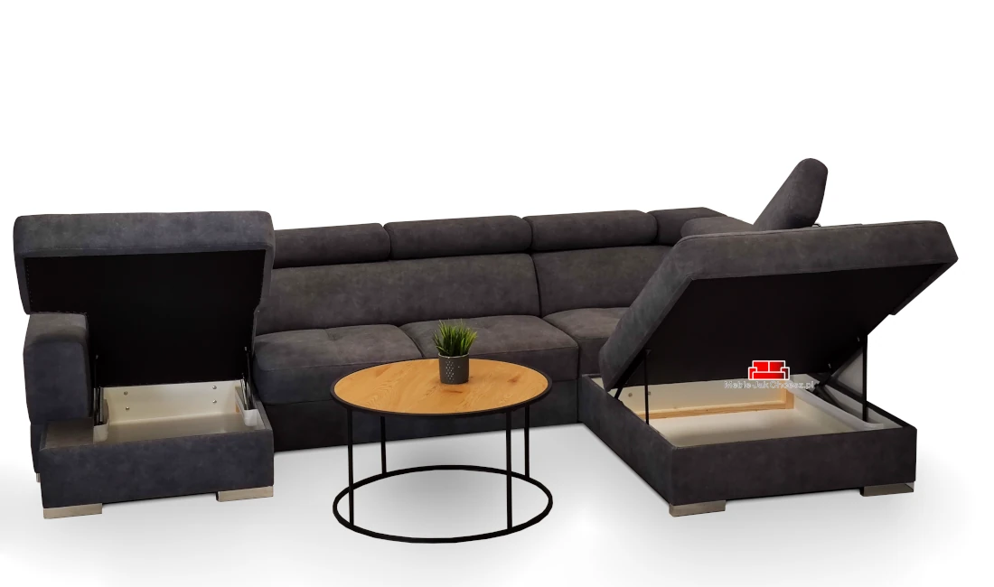 Funkcja spania typu „delfin” umożliwia szybkie i intuicyjne rozłożenie narożnika, tworząc wygodne miejsce do odpoczynku. Dodatkowo, pojemnik na pościel ukryty pod siedziskiem sprawia, że utrzymanie porządku staje się proste i wygodne.
